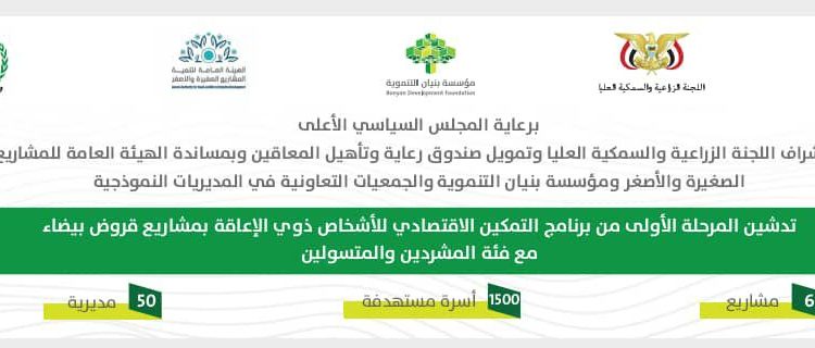 تشمل المرحلة الأولى من البرنامج، التي تنفذها اللجنة الزراعية والسمكية العليا بمساندة مؤسسة بنيان التنموية والهيئة العامة للمشاريع الصغيرة والأصغر، ستة مشاريع تستهدف ألفاً و500 أسرة من المعاقين وأسرهم في 50 مديرية.
