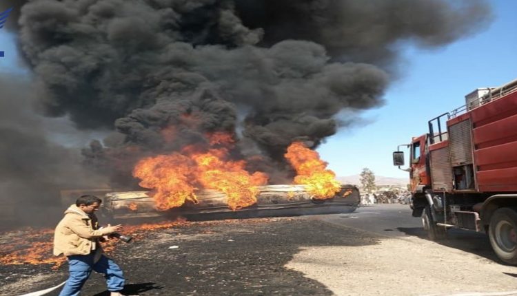 شاهد/ حريق هائل وفاة شخص وإصابة اخرون في حادث تصادم قاطرة وقود وسيارة لأحد المواطنين بصنعاء (فيديو وتفاصيل)