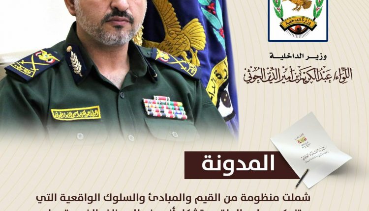 وأشار اللواء الحوثي إلى أن المدونة شملت منظومة من القيم والمبادئ التي ستنعكس على الواقع وتشكل أنموذجا للموظف الذي يتحمل المسؤولية أمام الله والقيادة والناس.