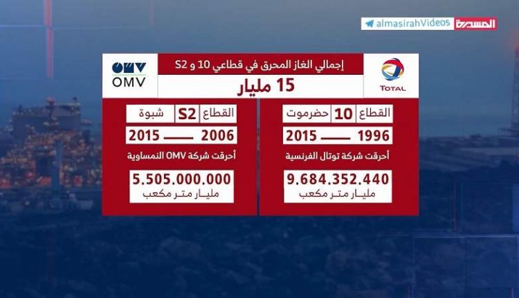 وأكد التحقيق أن شركة توتال الفرنسية أحرقت 9 مليارات وقرابة 700 مليون متر مكعب في قطاع 10 في حضرموت، موضحاً أن شركة (omv) النمساوية أحرقت 5 مليارات وأكثر من 500 مليون متر مكعب في قطاع (S2).