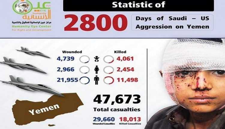 أصدر مركز عين الإنسانية، اليوم السبت، تقريراً يوثق جرائم العدوان الأمريكي السعودي الإماراتي بحق الشعب اليمني خلال 2800 يوم من العدوان.