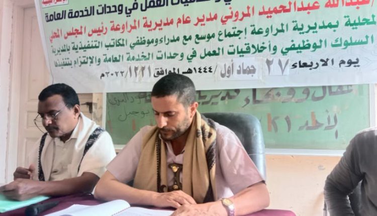 وفي التدشين اعتبر مدير عام المديرية العميد عبدالله عبدالحميد المروني مدونة السلوك الوظيفي نقلة نوعية في واقع العمل الوظيفي تهدف إلى تجويد الاداء المالي والإداري وتحسين الخدمات وتيسيرها للمواطنين في إطار الرؤية الوطنية الشاملة والمتكاملة لبناء الدولة اليمنية الحديثة.