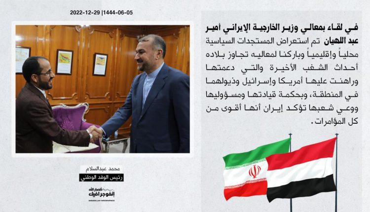 رئيس الوفد الوطني: في لقاء بمعالي وزير الخارجية الإيراني أمير عبد اللهيان تم استعراض المستجدات السياسية محلياً وإقليمياً وباركنا لمعاليه تجاوز بلاده أحداث الشغب الأخيرة والتي دعمتها وراهنت عليها #أمريكا و #إسرائيل وذيولهما في المنطقة، وبحكمة قيادتها ومسؤوليها ووعي شعبها تؤكد #إيران أنها أقوى من كل المؤامرات.