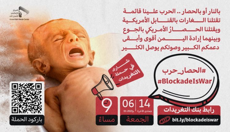 ودعا منظمو الحملة، الشعب اليمني إلى المشاركة الواسعة في حملة التغريدات، للتنديد باستمرار العدوان والحصار وإيصال معاناة الشعب اليمني إلى العالم والضغط على المجتمع الدولي لرفع الحصار، على الهشتاقين :