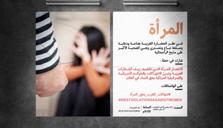 تنطلق الساعة التاسعة من مساء اليوم السبت حملة تغريدات عبر موقع التواصل الاجتماعي “تويتر”، بعنوان “المرأة في نظر الحضارة الغربية بضاعة ودعاية وسلعة تُباع وتُشترى وهي الضحية الأكبر على مذبح الرأسمالية”.