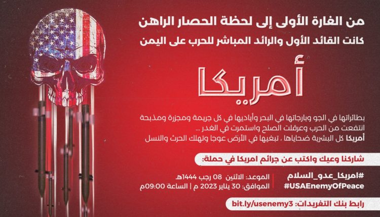 تنطلق الساعة التاسعة من مساء اليوم الاثنين، حملة تغريدات عبر موقع التواصل الاجتماعي “تويتر”، بعنوان “أمريكا عدو السلام”.