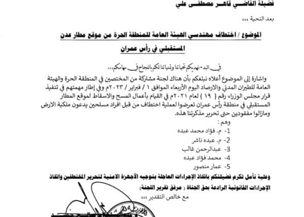 وأوضحت المصادر أن المسلحين اختطفوا خمسة مهندسين من ما تسمى “المنطقة الحرة، وهيئة الطيران المدني”، الأربعاء المنصرم، أثناء نزولهم إلى منطقة رأس عمران لغرض المسح والاسقاط لموقع مطار عدن المستقبلي -حسب زعم حكومة الخونة-.