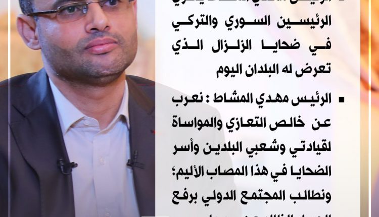 وعبر الرئيس المشاط في البرقيتين عن خالص التعازي والمواساة لقيادتي وشعبي البلدين وأسر الضحايا في هذا المصاب الأليم.. مطالباً المجتمع الدولي برفع الحصار الظالم عن سوريا.