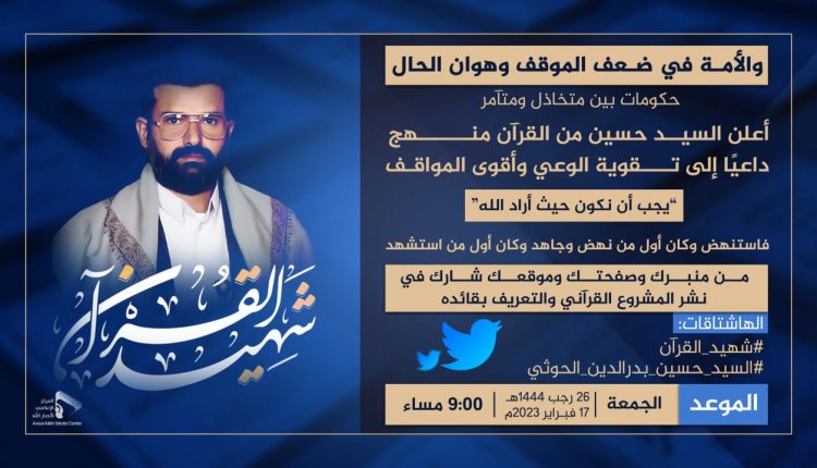 والأمة في ضعف الموقف وهوان الحال حكومات بين متخاذل ومتآمر، وشعوبها في موات عميم، أعلن الشهيد القائد، السيد حسين، من القرآن منهجاً، داعيًا إلى تقوية الوعي وأقوى المواقف.