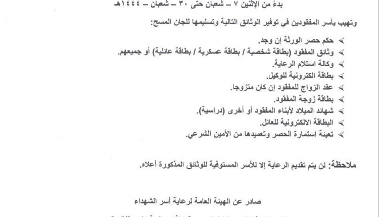 وأهاب البيان بكافة أسر المفقودين لدى العدو استكمال الوثائق المطلوبة واستيفاء كافة البيانات وتسليمها للجان المسح الميداني في الوقت المحدد ليتسنى للهيئة صرف الرعاية المستحقة لها.