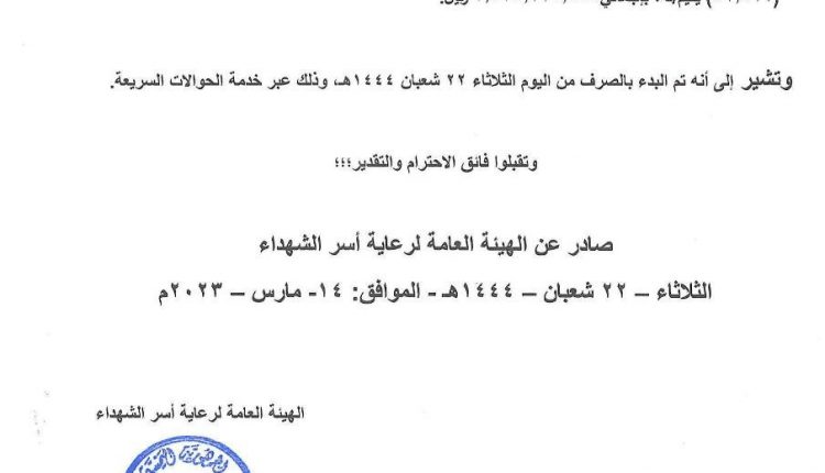 أعلنت الهيئة العامة لرعاية أسر الشهداء عن صرف كفالة أبناء الشهداء لشهري يناير- فبراير لعدد (٥١.٠١١) يتيم ويتيمة بمبلغ إجمالي (١.٠٢٠.٢٢٠.٠٠٠).