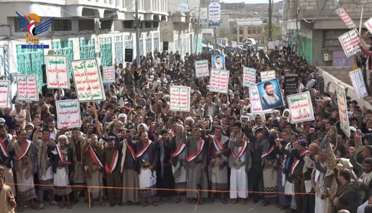 وأكد بيان صادر عن المسيرة أن العدوان والحصار الأمريكي السعودي الإماراتي على اليمن جريمة بحق الإنسانية في ظل تواطؤ المجتمع الدولي والأمم المتحدة.