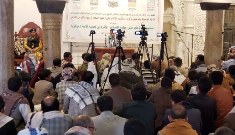 عقدت بالجامع الكبير بصنعاء، اليوم، ندوة توعوية بمناسبتي ذكرى استشهاد الإمام علي “عليه السلام” ويوم القدس العالمي بعنوان “استشهاد الإمام علي عليه السلام وأثره في قضية الأمة المركزية”، نظمتها وزارة الإرشاد وشؤون الحج والعمرة بالاشتراك مع دائرة الثقافة القرآنية بالمكتب التنفيذي لأنصار الله.