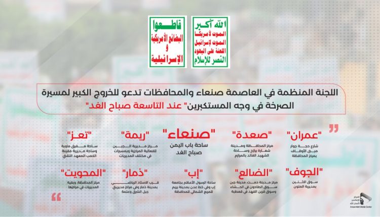 ساحات مسيرة "ذكرى الصرخة" غد الأربعاء في العاصمة صنعاء والمحافظات (انفو...) الساحات المحددة لمسيرات “ذكرى الصرخة” في العاصمة صنعاء والمحافظات (انفو…) الساحات المحددة لمسيرات “ذكرى الصرخة” غد الأربعاء في العاصمة صنعاء والمحافظات (انفو…) On مايو 23, 2023 Share يمني برس- انفوجرافيك ساحات مسيرة “ذكرى الصرخة” غد الأربعاء في العاصمة صنعاء والمحافظات (انفو…) Share