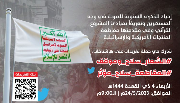إحياءً للذكرى السنوية للصرخة في وجه المستكبرين وتعريفاً بمبادئ المشروع القرآني وفي مقدمتها مقاطعة المنتجات الأمريكية والإسرائيلية، تدعو اللجنة المنظمة لحملة التغريدات الخاصة بمناسبة الذكرى السنوية للصرخة، جميع الشعب اليمني في أمانة العاصمة وكافة المحافظات اليمنية، إلى جانب كافة أحرار العالم، للمشاركة الفاعلة في حملة التغريدات التي ستنطلق مساء يوم غدٍ الأربعاء على هاشتاقات: