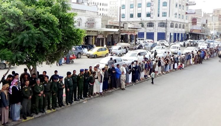 وقفة احتجاجية في مديرية الصافية بالأمانة تنديداً باستمرار العدوان في مفاقمة الوضع الانساني