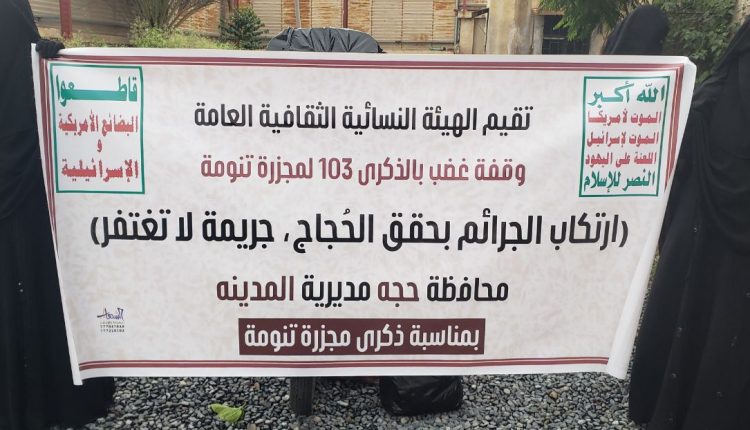 نظمت الهيئة النسائية بمحافظة حجة وقفات بعدد من المديريات بالذكرى 103 لمجزرة تنومة التي ارتكبها النظام الوهابي السعودي في محافظة عسير.