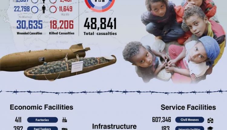 وأكد مركز عين الإنسانية استشهاد وجرح (48.841 ) مواطناً من المدنيين جراء العدوان على اليمن خلال 3000 يوم .. موضحا أن عدد الشهداء وصل إلى ( 18.206 ) مواطنين ، بينهم (4096) طفلا و( 2461 ) امرأة.