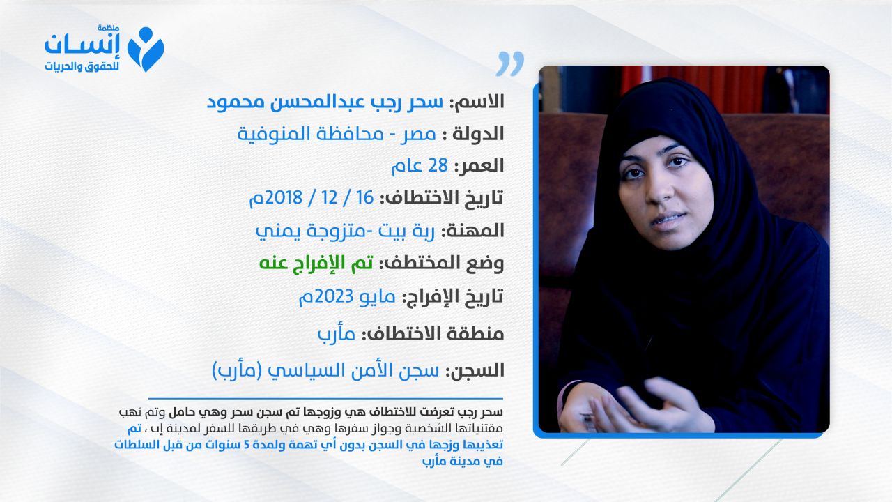 وكشفت مصادر إلى أن عملية اطلاق سراح “سحر” مع زوجها من السجن ووضعهم تحت الإقامة الجبرية جاء بعد المؤتمر الصحفي الذي تناول إحصائيات وتفاصيل عن المعتقلين المدنيين داخل سجون ميليشا الإصلاح بمأرب، وتم ذكر فيه المواطنة المصرية سحر رجب بعد الافادة من المحررة “سميرة مارش” عن ذلك، لتصبح “سحر” رهن الإقامة الجبرية مع اسرتها.