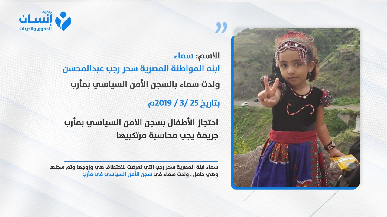 سحر “ربة بيت” تم اخفائها هي وزوجها وابنتها بشكل قسري في احد سجون الإصلاح بمحافظة مأرب المحتلة قرابة 5 سنوات كانت في وضع حمل بابنتها “سماء” التي اعتقلت وهي في بطن أمها وعاشت قبل ولادتها في العام 2019 م حالة الإخفاء القسري حتى تم اطلاق سراحهما في مايو 2023م ووضعهما تحت الإقامة الجبرية.