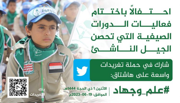 احتفالاً باختتام أنشطة وفعاليات الدورات الصيفية التي تحصن الجيل الناشئ، تنطلق مساء يومنا هذا الإثنين الأول من ذي الحجة 1444هـ الموافق 19 يونيو 2023م حملة تغريدات كبرى تفاعلاً مع الأنشطة الصيفية في مختلف المحافظات.