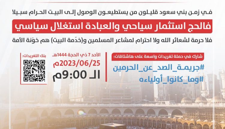 تنطلق تمام التاسعة من مساء اليوم الأحد, حملة تغريدات واسعة تنديداً بإجراءات النظام السعودي وتسيسه للحج والصد عن البيت والحرام.