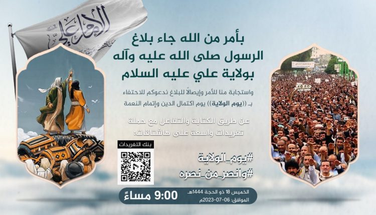 ودعا المنظمون إلى إحياء هذه المناسبة يوم اكتمال الدين وإتمام النعمة يوم نزل الأمر من الله لرسوله صلوات الله عليه وآله وسلم بإعلان علي عليه السلام ولياً للمؤمنين فقال بإجماع المسلمين “من كنت مولاه فهذا علي مولاه”، وإيصال بلاغ رسول الله صلى الله عليه وآله وسلم حين قال “فليبلغ الحاضر الغائب”، بالمشاركة في حملة التغريدات الواسعة على الهاشتاقات: