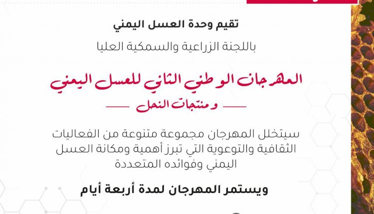 تستعد وحدة العسل اليمني في اللجنة الزراعية والسمكية العليا ووزارة الزراعة والري، لإقامة المهرجان الوطني الثاني للعسل اليمني ومنتجات النحل، مطلع أغسطس المقبل في حديقة السبعين بأمانة العاصمة.
