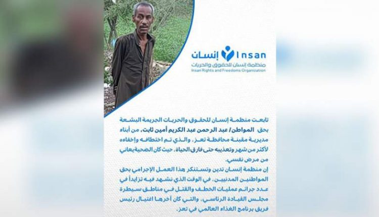 وأوضحت المنظمة في بيان أن المواطن عبدالرحمن ثابت من أبناء مديرية مقبنة كان يعاني من مرض نفسي وقد تم اختطافه وإخفاؤه لأكثر من شهر قبل أن يفارق الحياة نتيجة التعذيب.