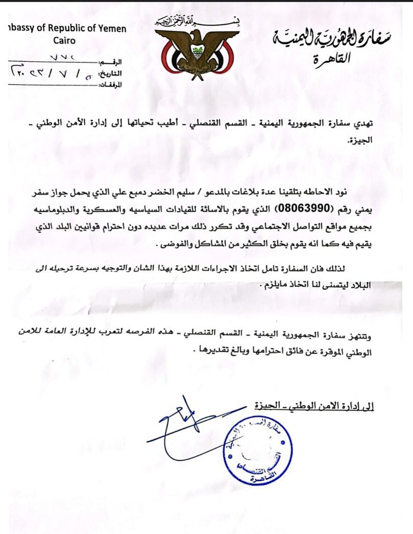الجدير بالذكر أن سفير حكومة المرتزقة قد أصدر أكثر من55مذكره ترحيل بحق اي مواطن يمني ينتقد السفاره على شبكات التواصل الاجتماعي.