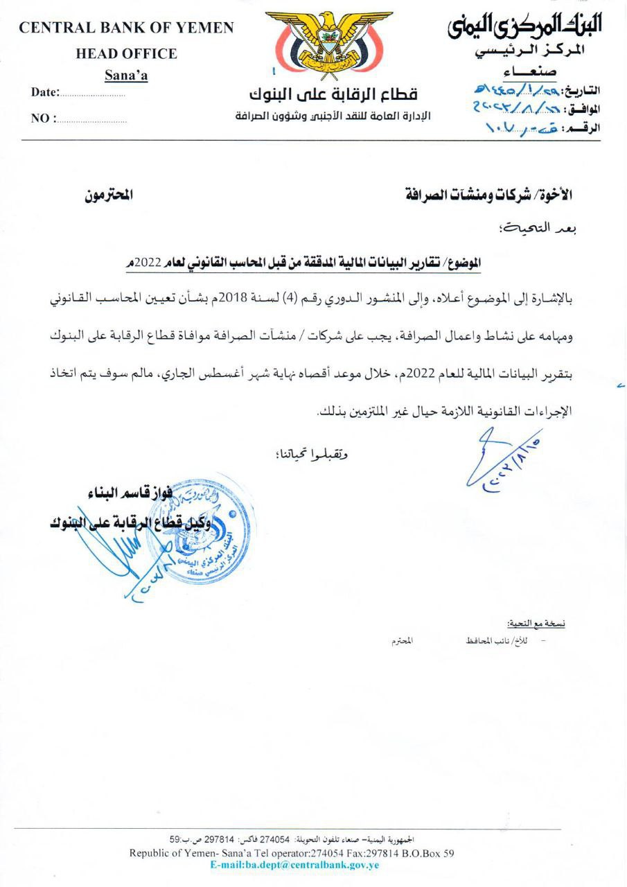 أصدر البنك المركزي اليمني بصنعاء، ، تعميماً لكافة شركات ومنشآت الصرافة، بشأن البيانات المالية للعام 2022م.