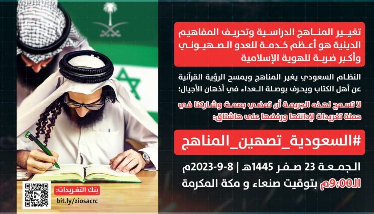 وأوضح منظمو الحملة أن النظام السعودي يغير المناهج ويمسح الرؤية القرآنية عن أهل الكتاب ويحرف بوصلة العداء في أذهان الأجيال، مشيرين إلى أن تغيير المناهج الدراسية وتحريف المفاهيم الدينية هو أعظم خدمة للعدو الصهيوني وأكبر ضربة للهوية الإسلامية.