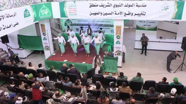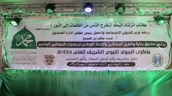 فيما أشار رئيس صندوق رعاية وتأهيل المعاقين الدكتور علي مغلي الى أن الاحتفاء بذكرى المولد النبوي الشريف على صاحبها واله افضل الصلاة والسلام يجسد المحبة الصادقة وارتباط ابناء اليمن الوثيق بالرسول صلى الله عليه وآله وسلم.