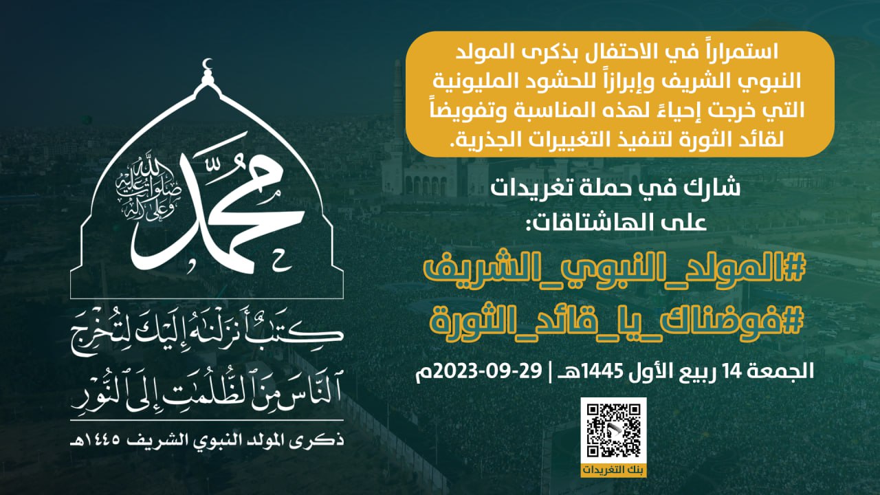 استمراراً في الاحتفال بذكرى المولد النبوي الشريف وإبرازاً للحشود المليونية التي خرجت إحياءً لهذه المناسبة وتفويضاً لقائد الثورة لتنفيذ التغييرات الجذرية، تنطلق في تمام الساعة التاسعة من مساء اليوم الجمعة، حملة تغريدات واسعة على منصة “إكس”.