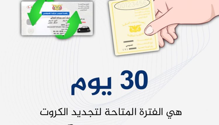 دعت شرطة المرور جميع الأخوة السائقين ومالكي المركبات التي لاتزال تحمل الوثائق اليدوية رخص التسيير (كرت الملكية)، إلى التوجه طوعياً إلى الإدارة العامة للمرور وفروعها بأمانة العاصمة والمحافظات لتصحيح أوضاعهم وتغييرها من يدوية إلى آلية، خلال مدة أقصاها شهر.