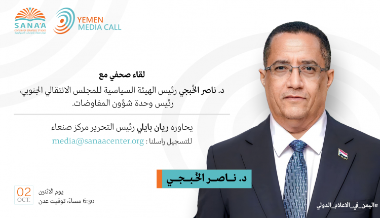يستضيف مركز صنعاء للدراسات الاستراتيجية الدكتور ناصر الخُبجي رئيس الهيئة السياسية لما يسمى بالمجلس الانتقالي الجنوبي، رئيس وحدة شؤون المفاوضات.