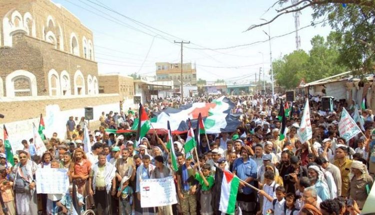 وردد المحتشدون في المسيرات الشعارات المؤكدة على الوقوف إلى جانب الشعب الفلسطيني ومقاومته الباسلة في مواجهة الكيان الصهيوني الغاصب، رافعين العلمين اليمني والفلسطيني واللافتات المباركة لعملية طوفان الأقصى.