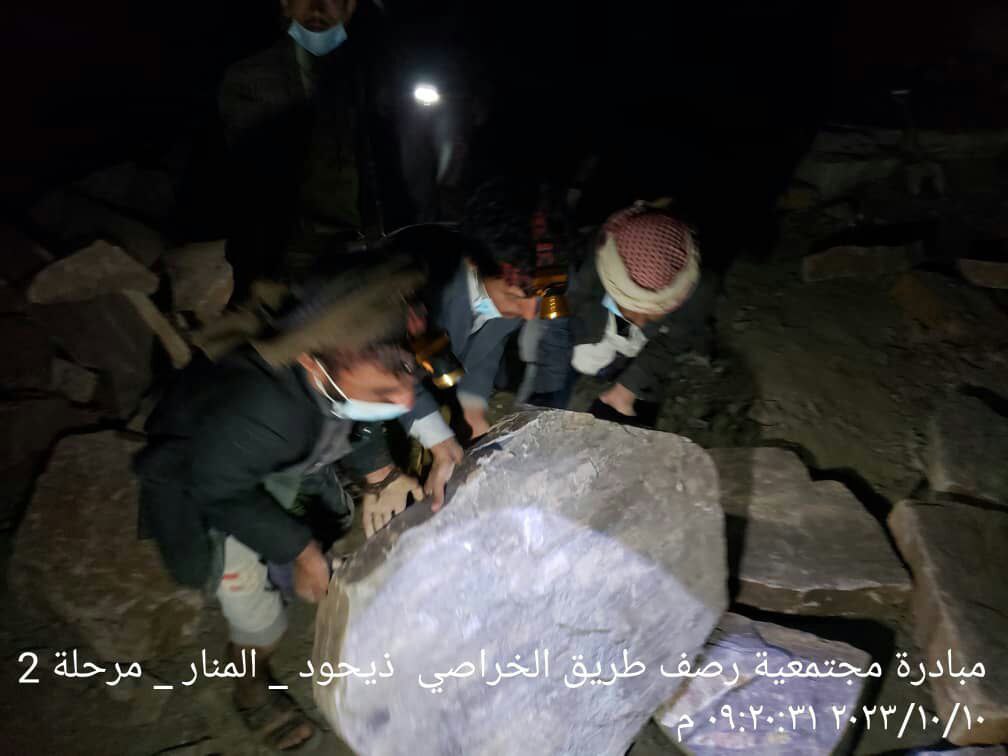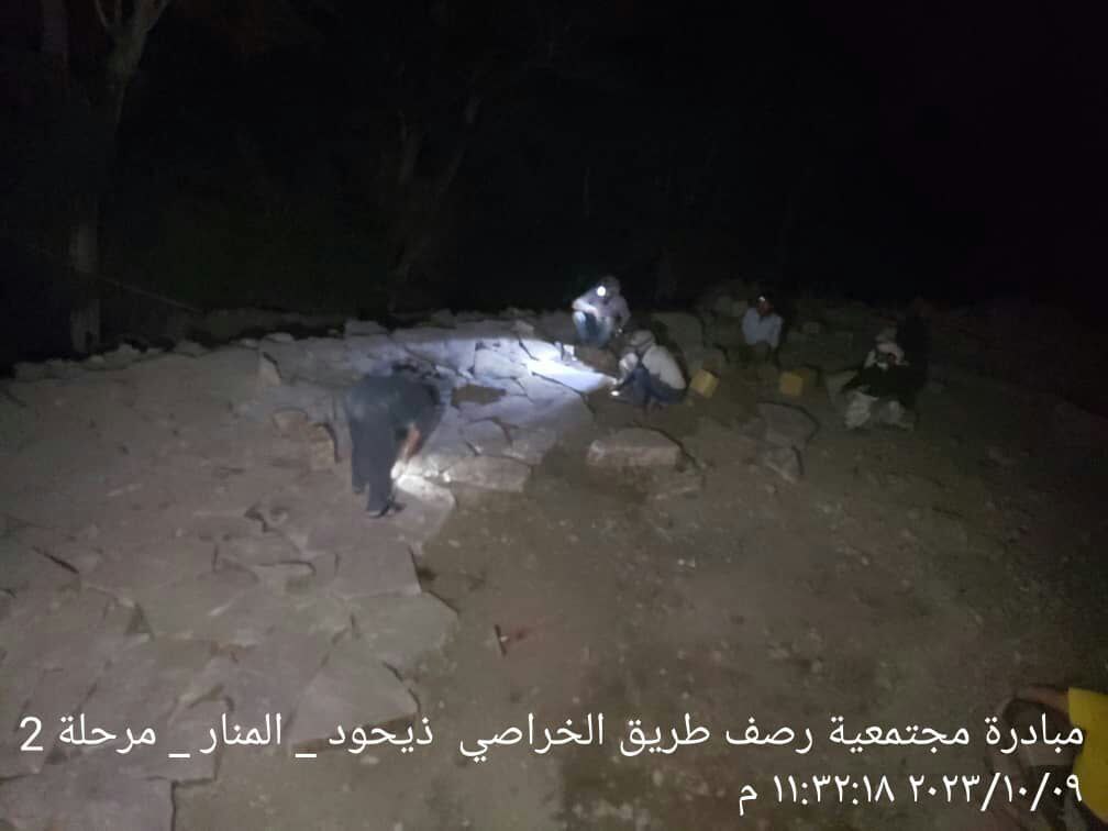 بالصور.. أهالي قرية ذيحود يواصلوا تنفيذ المرحلة الثانية من رصف طريق الخراصي في ساعات الليل