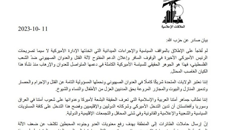 عاجل| بيان صادر عن #حزب_الله ردًا على تصريحات الرئيس الأميركي وإرسال حاملة الطائرات “النص”