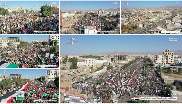 وأظهرت الصور الجوية، السيل الجرار والطوفان الهادر الذي خرج به الشعب اليمني في العاصمة صنعاء اسناداً ودعماً للشعب الفلسطيني وعملية طوفان الأقصى.
