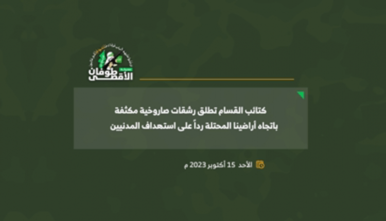 ورد الآن.. مشاهد لإطلاق كتائب القسام رشقات صاروخية مكثفة باتجاه الأراضي المحتلة رداً على استهداف المدنيين (فيديو) Last updated أكتوبر 15, 2023 Share يمني برس| ورد الآن.. كتائب القسام تبث مشاهد لإطلاق رشقات صاروخية مكثفة باتجاه الأراضي المحتلة رداً على استهداف المدنيين (فيديو) 15.10.2023رشقات Share