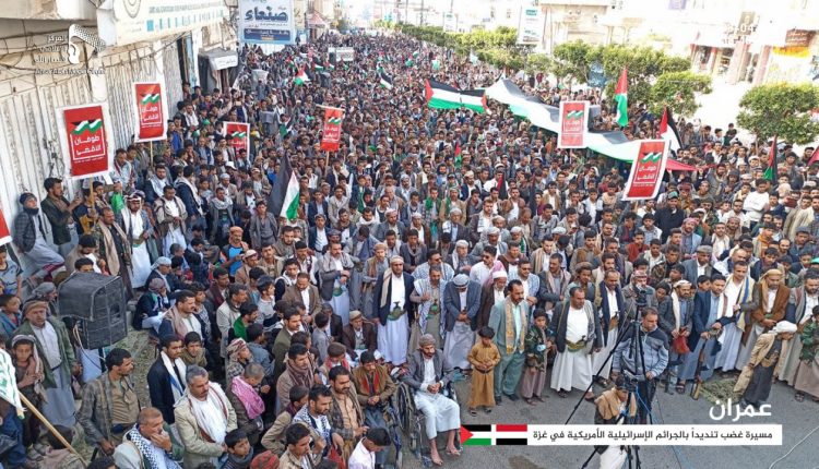 مسيرة حاشدة بمحافظة عمران استنكاراً لجرائم العدو الإسرائيلي بحق الشعب الفلسطينيين
