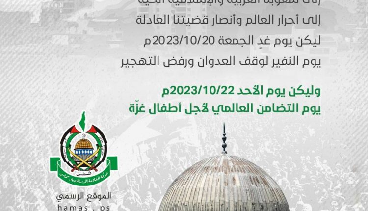 دعت حركة “حماس” الفلسطينية الشعب الفلسطيني والشعوب العربية والإسلامية وأحرار العالم وأنصار قضيَّتنا العادلة إلى النفير، يوم غد الجمعة 20 أكتوبر، وإلى جعل يوم الأحد يومًا للتضامن العالمي لأجل أطفال غزة. وذلك في ظل “حرب الإبادة الجماعية والمجازر المروّعة التي يرتكبها العدو الإسرائيلي وحكومته الفاشية ضدّ أبناء شعبنا الفلسطيني، المدنيين العزَّل في قطاع غزّة”.