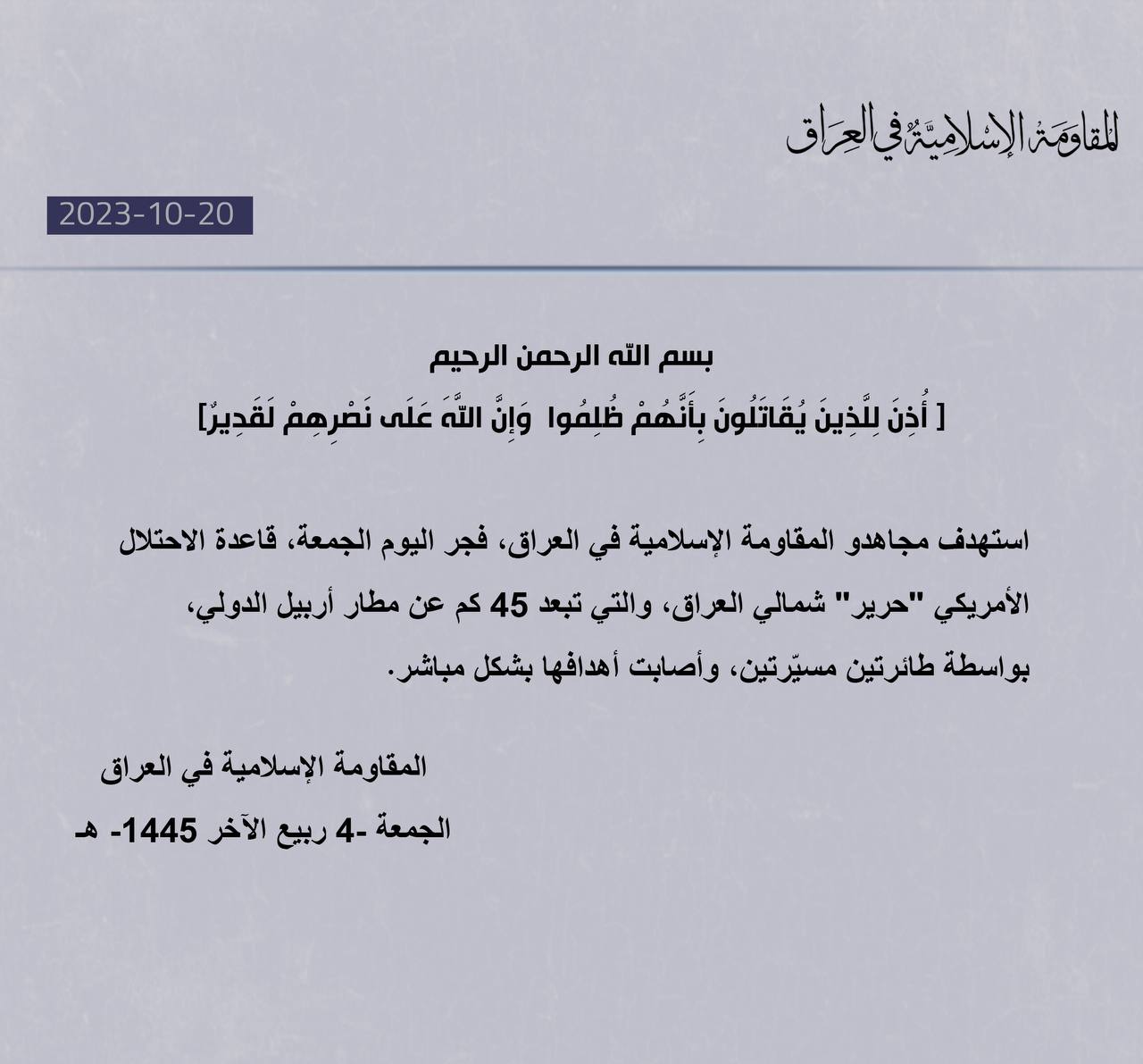 بيان صادر عن #المقاومة_الاسلامية في #العراق: استهدف مجاهدو المقاومة الإسلامية في العراق، فجر اليوم الجمعة، قاعدة الاحتلال #الأمريكي “حرير” شمالي العراق، والتي تبعد 45 كم عن مطار أربيل الدولي، بواسطة طائرتين مسيّرتين، وأصابت أهدافها بشكل مباشر.
