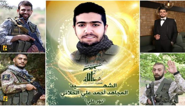 وقالت المقاومة في بيان “بمزيد من الفخر والاعتزاز، تزف المقاومة الإسلامية الشهداء المجاهدين علي يوسف أبو خليل “ذو الفقار” من بلدة القليلة جنوبي لبنان، وأحمد علي الحلاني “نور علي” من بلدة الحلانية في البقاع، وعلي محمود مرمر “أبو تراب” من بلدة الطيبة جنوب لبنان، وجعفر عباس أيوب “ذو الفقار” من بلدة يونين في البقاع، وحيدر خضر عياد “محمد جواد” من بلدة طيرفلسيه جنوب لبنان، والذين ارتقوا أثناء قيامهم بواجبهم الجهادي”.