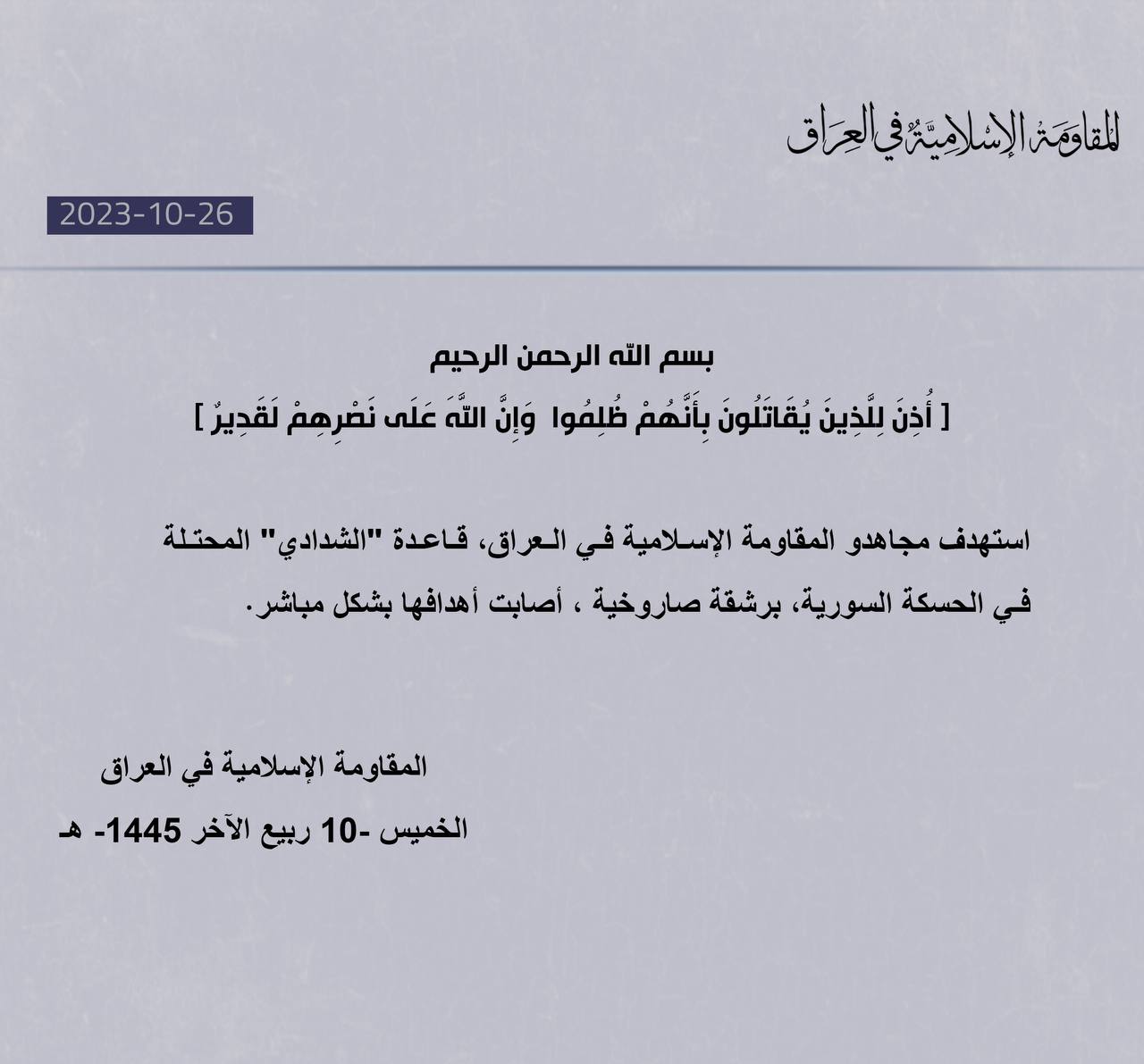 في بيان لها مساء، اليوم، أعلنت المقاومة الإسلامية في العراق استهداف مجاهدوها قاعدة “الشدادي” المحتلة في الحسكة السورية، برشقة صاروخية ، أصابت أهدافها بشكل.