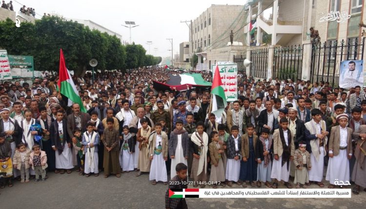واستنكر أبناء محافظة حجة صمت المجتمع الدولي والأمم المتحدة إزاء جرائم الكيان الغاصب .. محملين دول الاستكبار العالمي بقيادة أمريكا والدول الغربية مسؤولية ما يجري من مجازر بحق الأرض والإنسان في قطاع غزة.