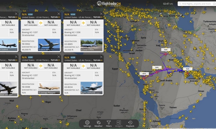 أظهرت حركة الملاحة الجوية، حسب ما تبينه مواقع تتبع الملاحة على الإنترنت، عدداً كبيراً من الطائرات الحربية المقاتلة الأمريكية والطائرات الخاصة بالدعم اللوجستي وتزويد المقاتلات في الجو بالوقود، تعمل فوق منطقة خليج العقبة وقبالة إيلات جنوب فلسطين المحتلة.