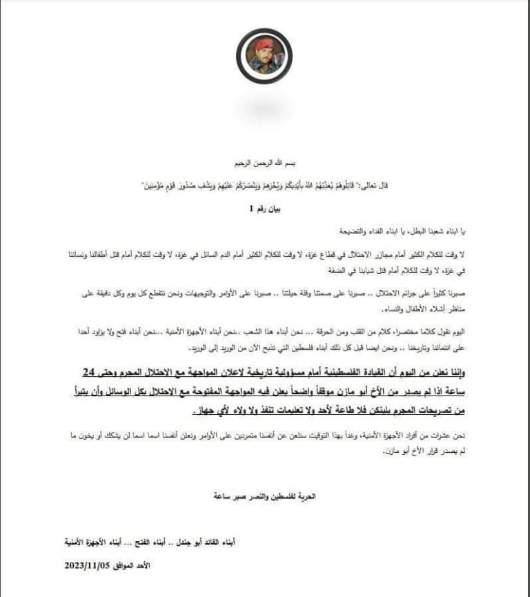 وقال بيان لمجموعة من أفراد الأجهزة إنه إذا لم يعلن الأخ أبو مازن موقفا واضحا يتبنى فيه المواجهة الشاملة مع الاحتلال، وإذا لم يتبرأ من تصريحات المجرم بلينكن (وزير الخارجية الأمريكي)، فلا طاعة لأحد، ولا تعليمات تنفذ، ولا ولاء لأي جهاز.