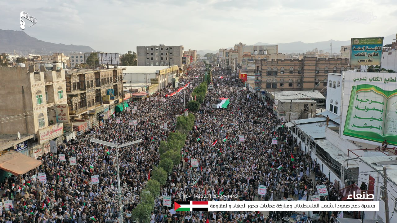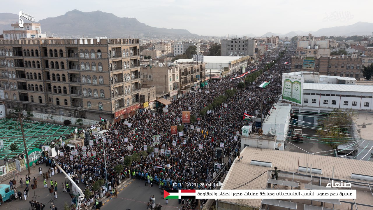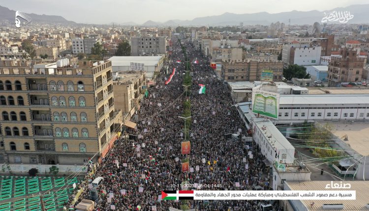 واحتشد عشرات الآلاف في شارع المطار بالعاصمة صنعاء الذين تقاطروا من كل الأحياء والحارات، حاملين الأعلام الفلسطينية واللافتات المؤكدة على مساندة الشعب اليمني ودعمه الكامل والمستمر للشعب الفلسطيني ومقاومته الباسلة ومباركته لعملية “طوفان الأقصى” حتى تحقيق النصر ودحر الاحتلال الصهيوني.